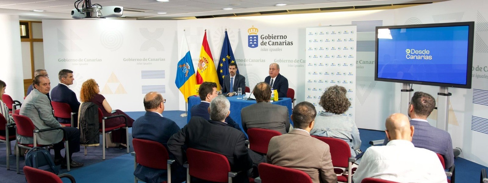 El viceconsejero de Economía e Internacionalización del Gobierno de Canarias y vicepresidente de Proexca, Gustavo González de Vega, y el presidente regional de Asinca, Virgilio Correa Suárez, presentaron este jueves la campaña DesdeCanarias para productos de la marca Elaborado en Canarias, una iniciativa de comunicación destinada a poner en valor el sello de origen de los productos canarios y promover su consumo en la Península.